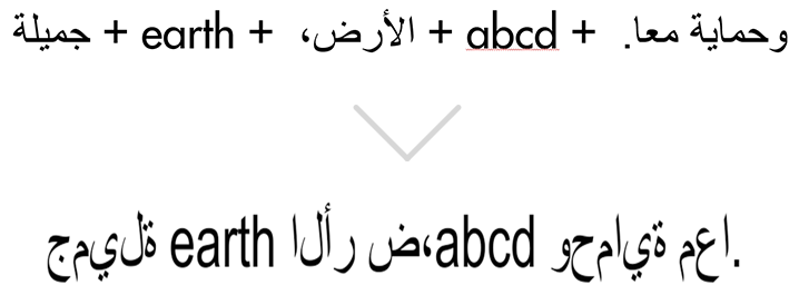 Unishape 처리 시 아랍어는 오른쪽에서 왼쪽으로 출력되지만, 라틴글자들은 왼쪽에서 오른쪽으로 출력.